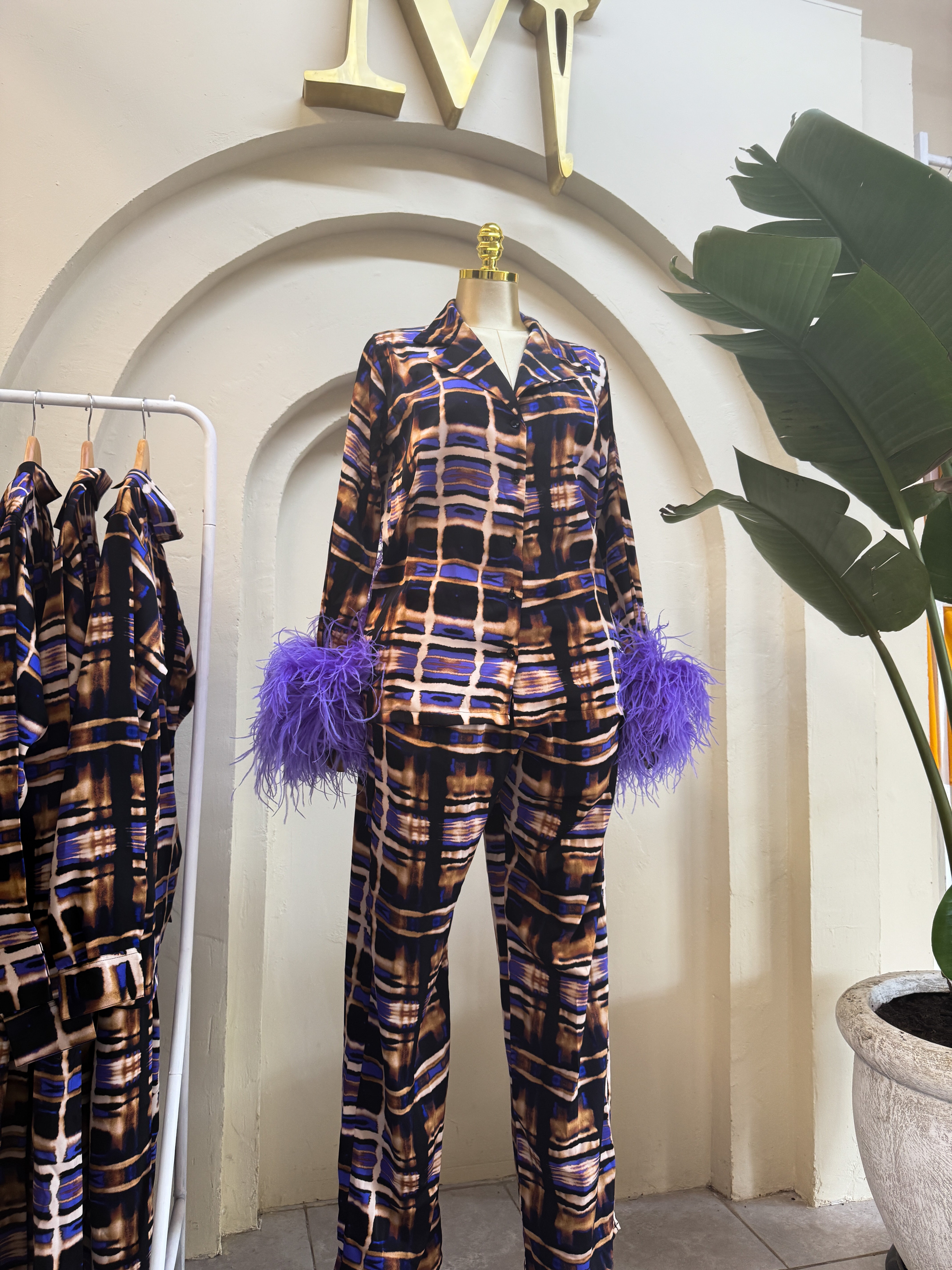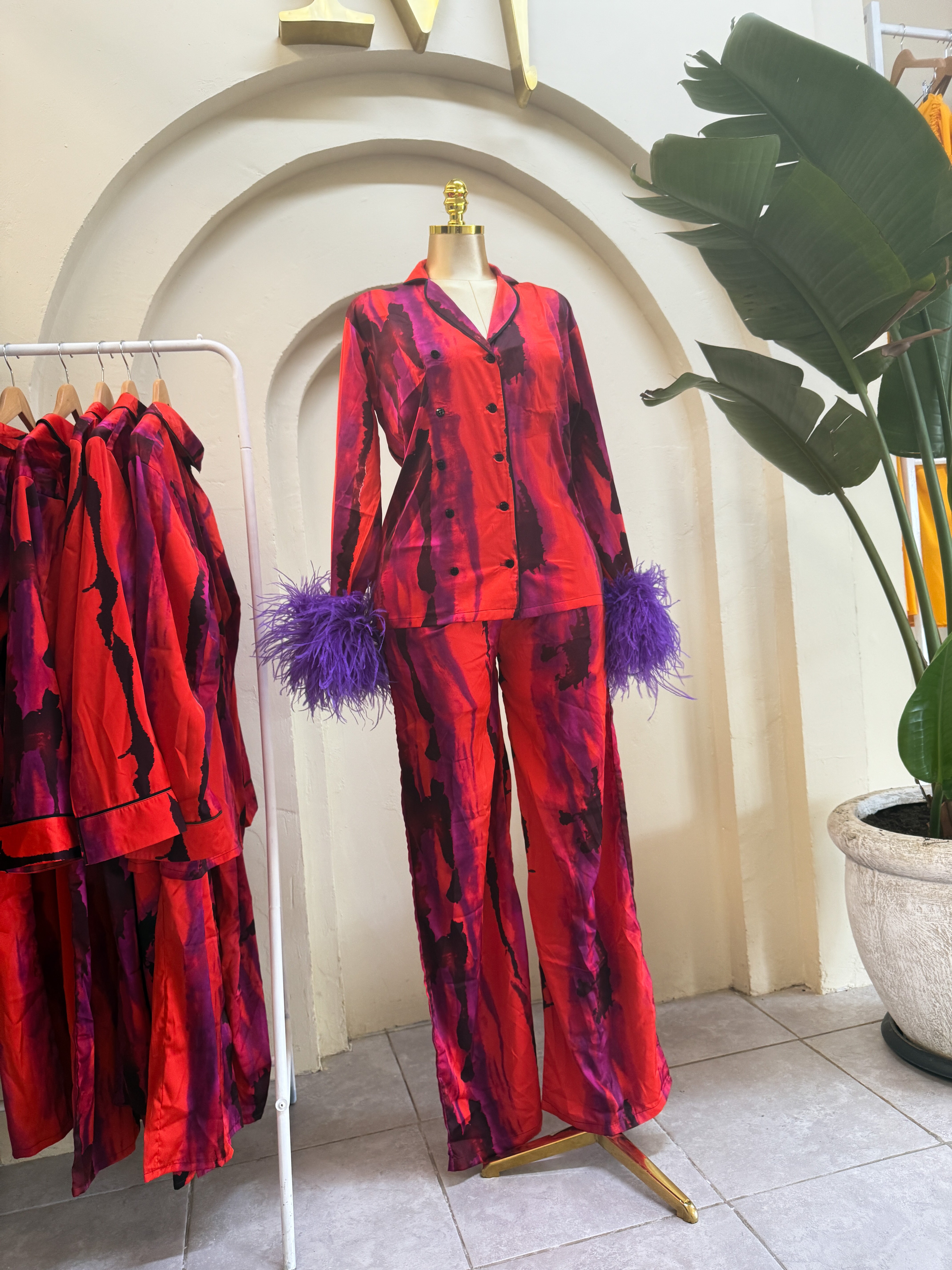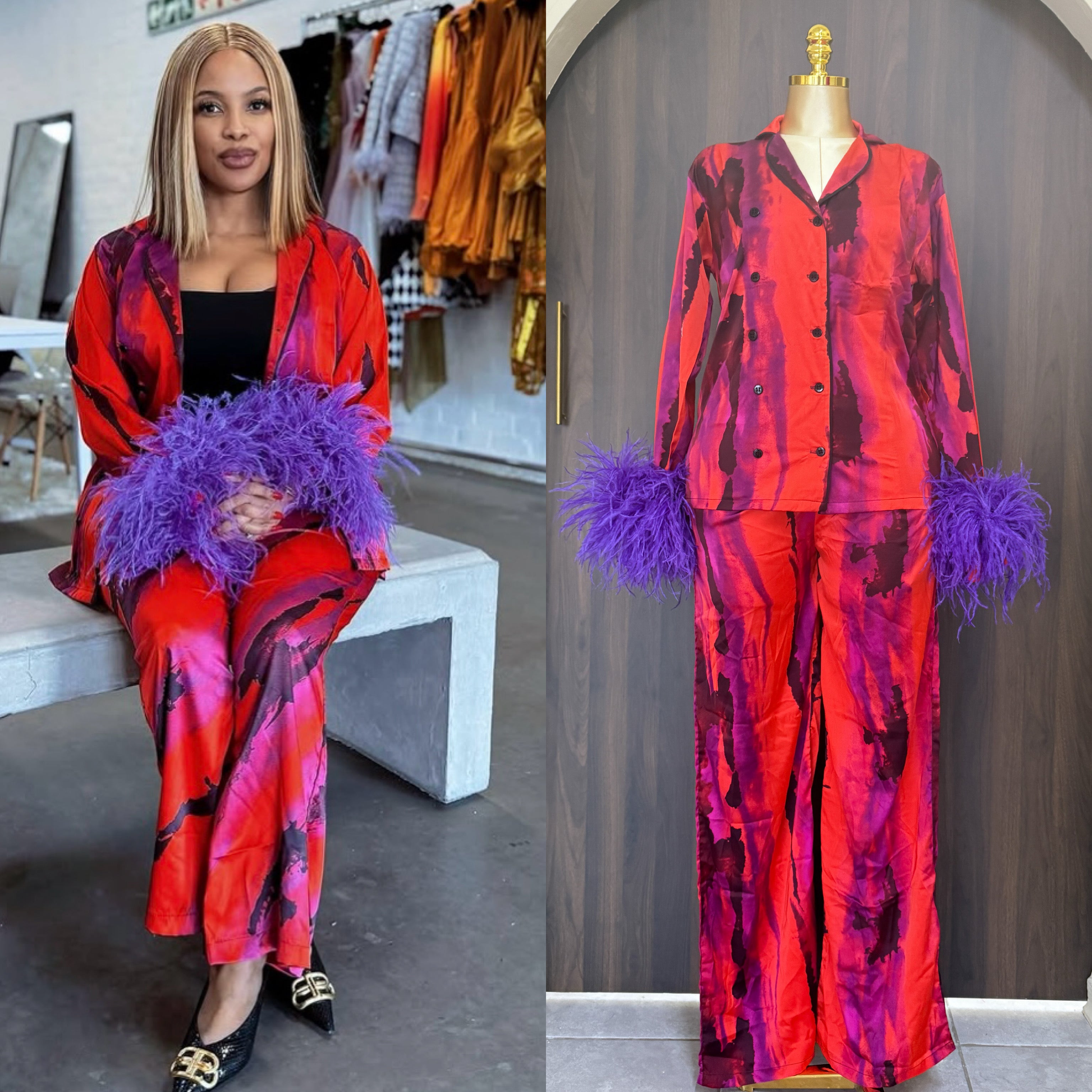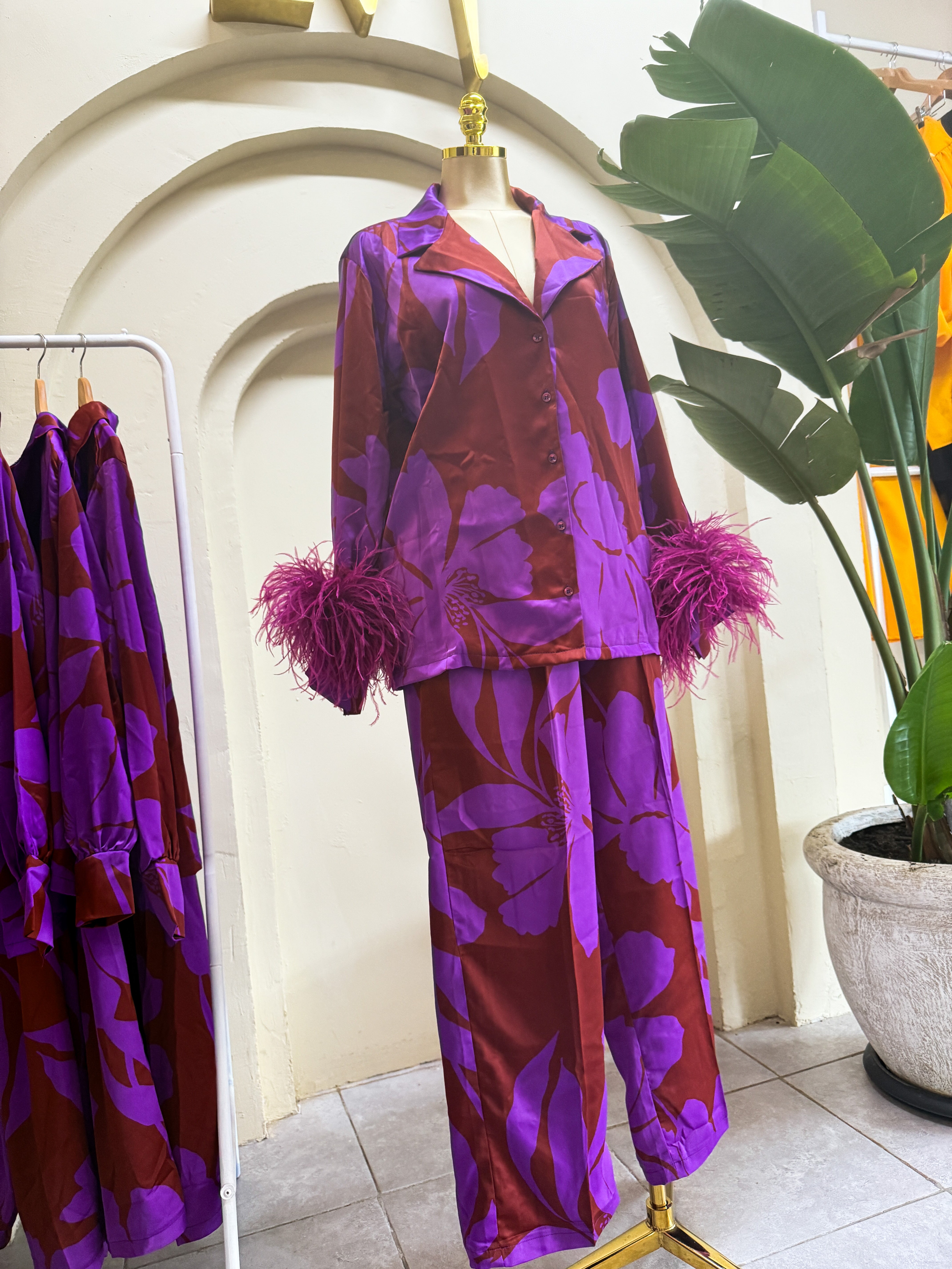 Silky Pyjamas Elastic trousers 44in length Top 28 inches length Long sleeves Buttin details Please select through the colour and size desired.